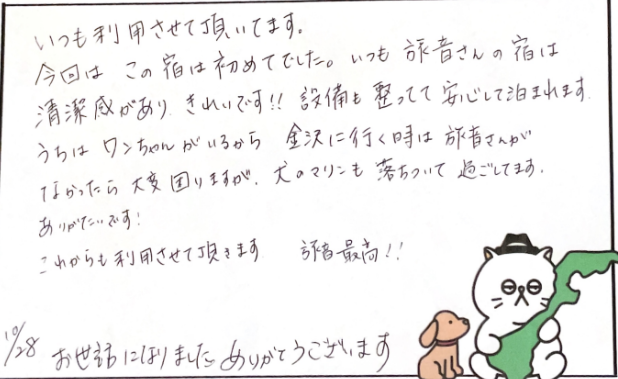 うちはわんちゃんがいるから金沢に行く時は旅音さんがなかったら大変困りますが、犬のマリンも落ち着いて過ごしてます。ありがたいです!