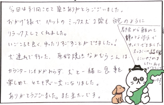 おかげ様でペットのミックス2頭も自宅のようにリラックスしてくれました。